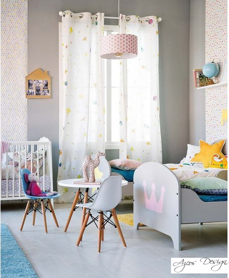 Una habitación en tonos suaves; gris y blanco mezclados con mobiliario en colores fuertes como los cojines , sillas, mesitas y alfombras para hacer de la habitación un lugar alegre para las niñas.