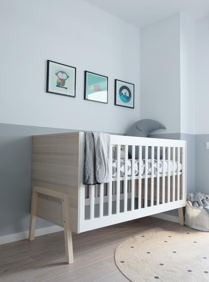 Las paredes de la habitación juegan con la mitad superior en blanco, y la mitad inferior en un tono gris clarito muy sufrido para el día a día de un niño que poco a poco irá creciendo. Tal y como nos cuenta Patri, la mamá de Pau, les costó mucho elegir el tono exacto de gris, de hecho, llegaron a elegir entre un total de 20 tonalidades distintas de este color. El mobiliario juega con el blanco, la madera natural, el negro y algún toque de mint en la decoración.