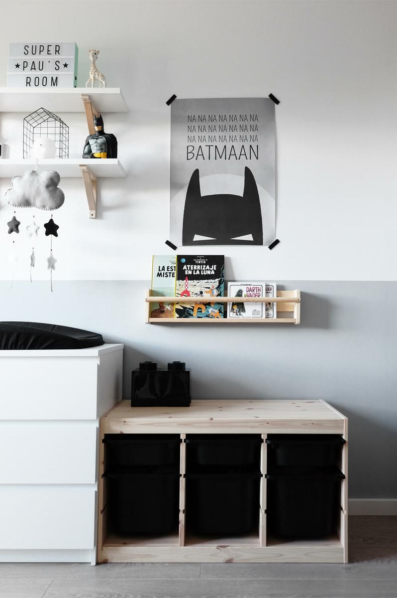El personaje estrella de la habitación es el superhéroe Batman. Lo encontramos en la estantería blanca y en una lámina colgada en la pared de un estilo muy vintage. Está claro que a los padres de Pau les gusta mucho las historias de acción, aventuras y de superhéroes. En la pequeña librería Flisat de Ikea reconocemos libros de Tintín y de Star Wars con la colección Darth Vader e hijo de Jeffrey Brown. Debajo tienen la combinación de almacenaje Trofast de Ikea perfecta para guardar juguetes y ropita para cuando Pau vaya creciendo. Encima tienen la cajita de almacenaje Lego 4 en color negro.