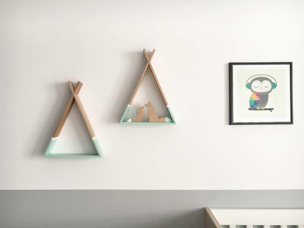 En la estantería blanca, justo encima del cambiador, también reconocemos la luz quitamiedos del fantasmita y la LightBox Mint de A Little Lovely Company. En tonos mint también han escogido dos estanterías tipi de Petit Monkey y los zorros decorativos de madera Foxy en blanco y mint.