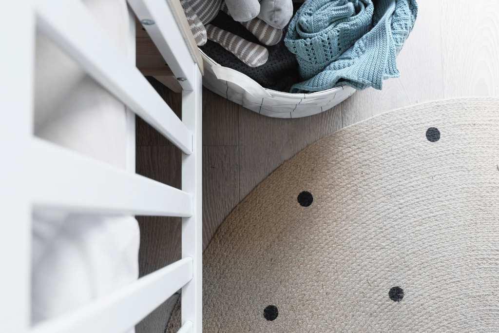 Para crear un espacio aún más cálido y acogedor, en el suelo hay la alfombra redonda “Black Dots” de Ferm Living. Y cerca de la cunita han optado por poner una cestita de tela donde guardar los muñecos y alguna mantita.