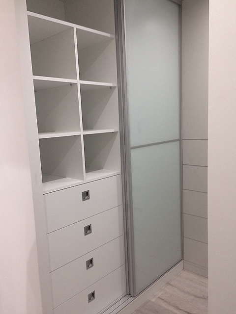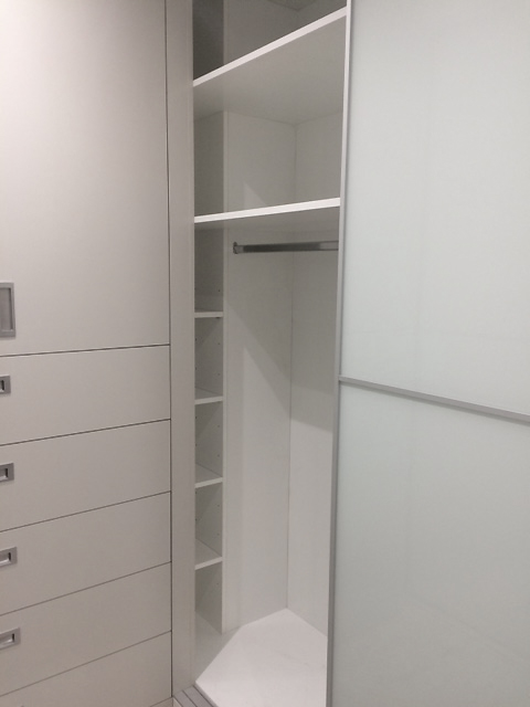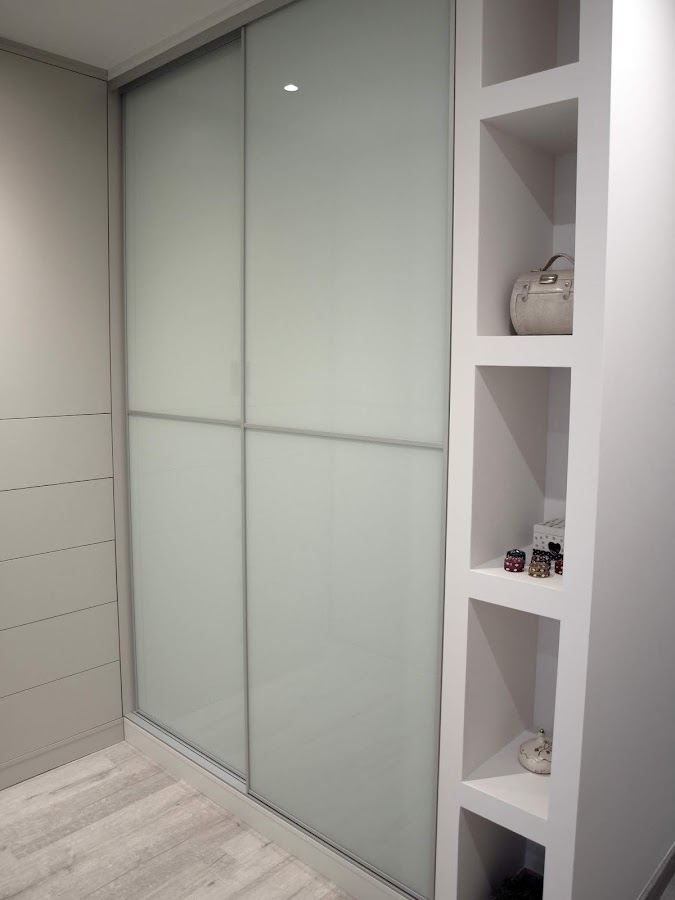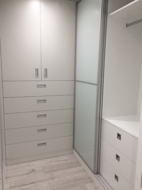 Armario frontal corredero 240*200 con 4 cajones a medida, acabado exterior Lacobel Blanco