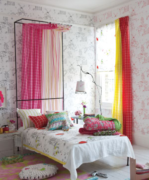 Combinando ropa de cama, cojines, cortinas y papel pintado evocan mundos óníricos lleno de toques vintage y románticos, muy en la línea de la firma.