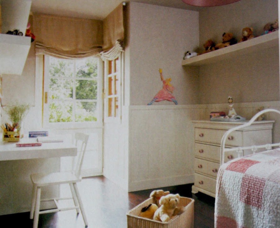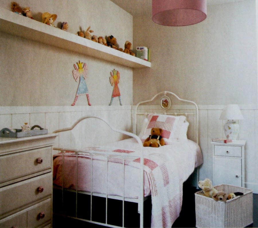 Por último el rosa y el azul definen la decoración de estos dormitorios. La ropa de cama, las pantallas de las lamparas y los pomos de los cajones se encargan de lucir estos colores. Una cama de forja pintada la otra de madera, amabas en blanco pintadas.Las dos habitaciones tienen idénticas estanterias y escritorios de madera lacada muy funcionales y hechos para durar muchos años. Las habitaciones se han vestido con zócalos altos de madera en blanco todo para lograr una gran claridad.