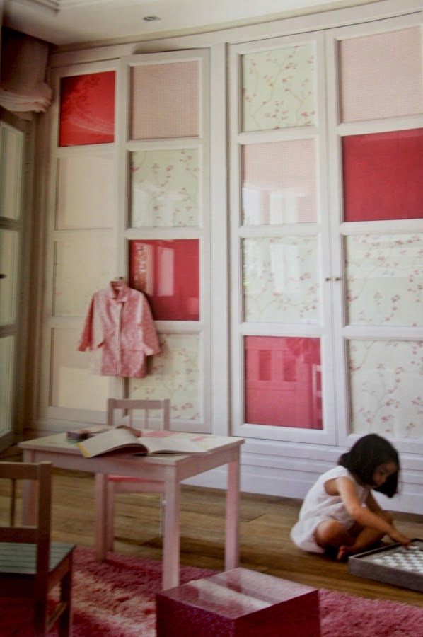 En el primero de los dormitorios destaca una composición geométrica en las puertas de los armarios, detrás del cristal se alternan papeles de color liso y estampados en diferentes tonos de rosa.