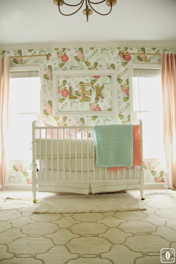 Un gran alfombra con celosía preside la habitación, para los peques viene genial así no empiezan a gatear por los suelos jeje. Un conjunto precioso el marco con las iniciales y la cuna es simplemente fantástico.