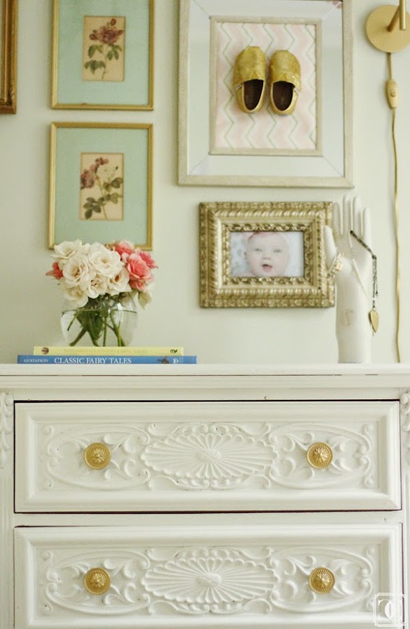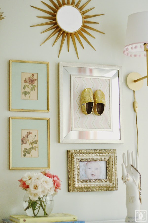 Detalles de una pared, es la composición de cuadros, con marcos en oro y cristal. El de los zapatitos fue un DIY sencillo y ha quedado muy bonito. Esos zapatos son de la peque con los que empezó a dar a sus primeros pasitos. Cogió un cartón lo cubrió con tela y seguidamente pego los zapatos, y así tendremos ese recuerdo tan especial en tan solo 2 minutos.