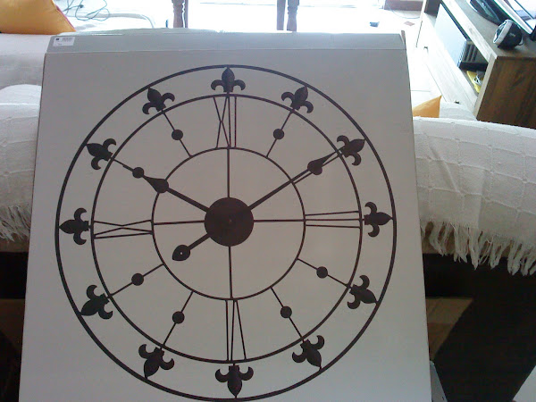 En la parte trasera le pegamos con unos tornillos un herraje para poder colgarlo a la pared. Le abrimos un agujero central para poder pasar el mecanismo y el reloj empezó a cobrar vida ^^.