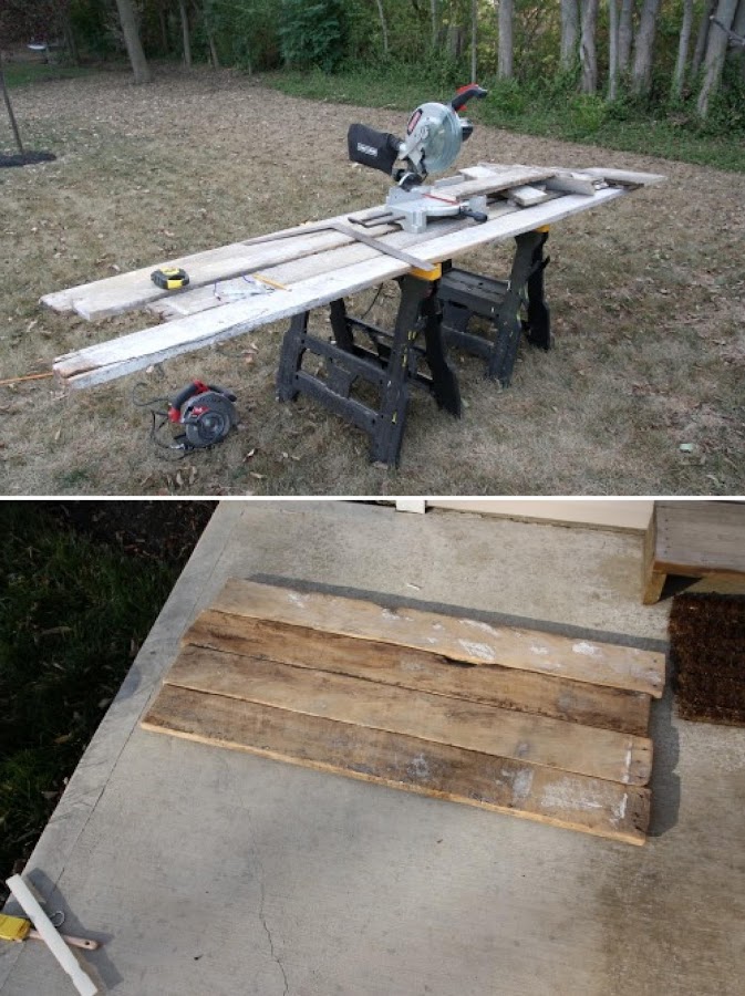 en la primera foto han usado un palet entero, otra manera de hacerlo es desmontarlo, e ir juntando las maderas hasta llegar a la altura deseada