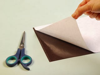 Cortar la plancha imantada del tamaño de la foto. Quitar el papel protector, para dejar descubierto el lado autoadhesivo.