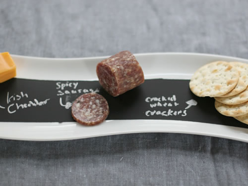 Se trata de una bandeja de porcelana convertida en pizarra , te preguntarás para que sirve , pues bien no te ha pasado nunca que cuando sirves una bandeja variada de quesos o patés y siempre hay alguien que pregunta de que son cada uno ? pues bien con esta bandeja no vas a tener que pensar de que son , si no que lo podrán leer en la bandeja.