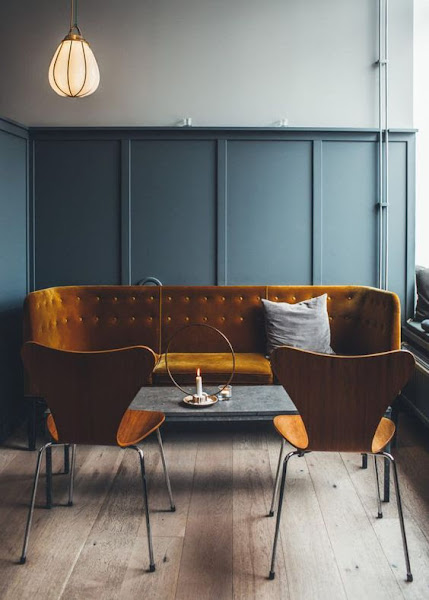 "Si la técnica del half painted se aplica además a los muebles e inluso a las puertas utilizando el mismo tono para pintarlos el efecto es de woooww!"Como en esta imágen que os muestro primero, en el que se ha elegido la tapicería del sofá del mismo tono que la pintura.
