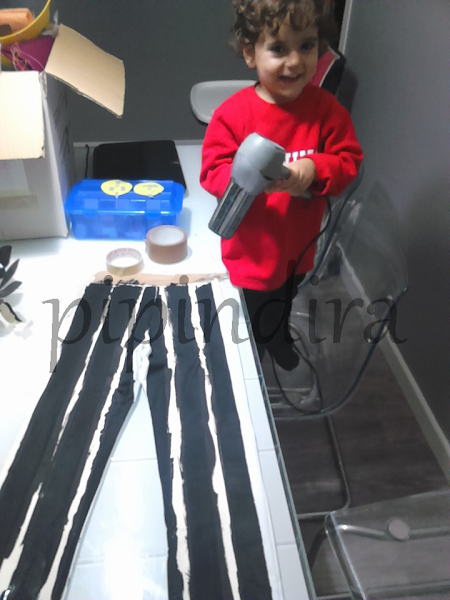 Aquí eran las 11 de la noche y Unai no tenía la más mínima intención de dormirse así que lo tuve de ayudante. Como teníamos prisa íbamos secando las rayas con el secador jajajaja.