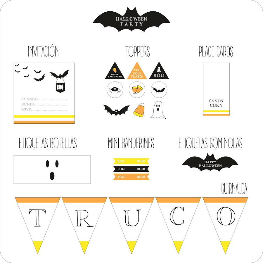 El otro pack imprimible, también de estilo minimalista y moderno, incorpora los colores amarillo y naranja, inspirado en los Candy Corn, los caramelos más famosos de Halloween.