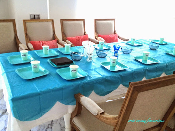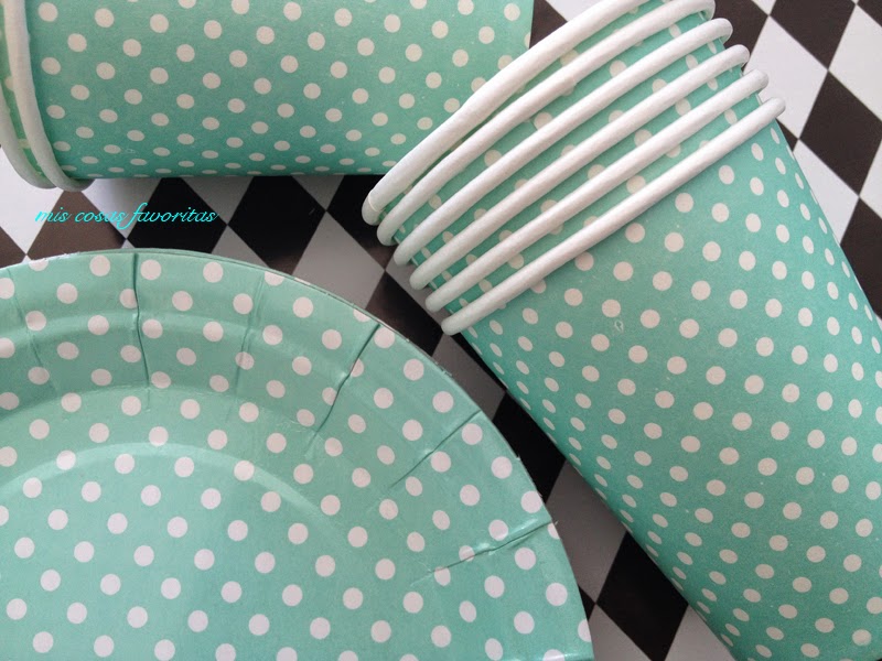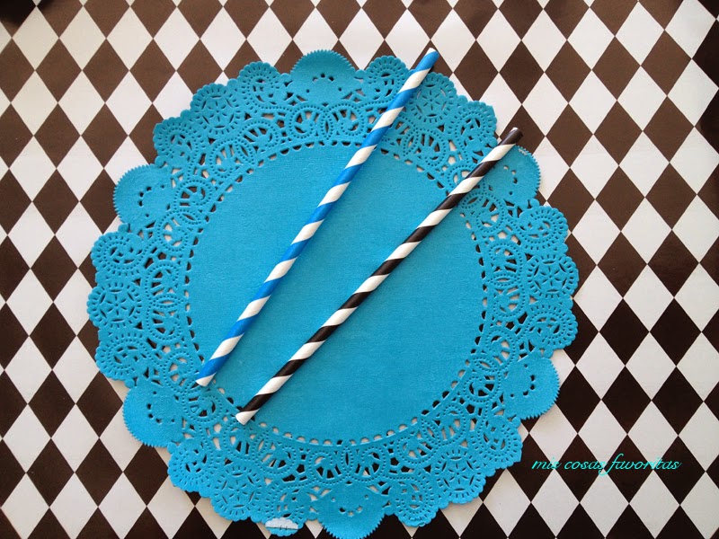 Me vino como anillo al dedo que el cumpleañero eligiera esos tonos, encontré un papel continuo de rombos en Tiger también las blondas, servilletas de papel, los vasos y platos de lunares y las pajitas rayadas.