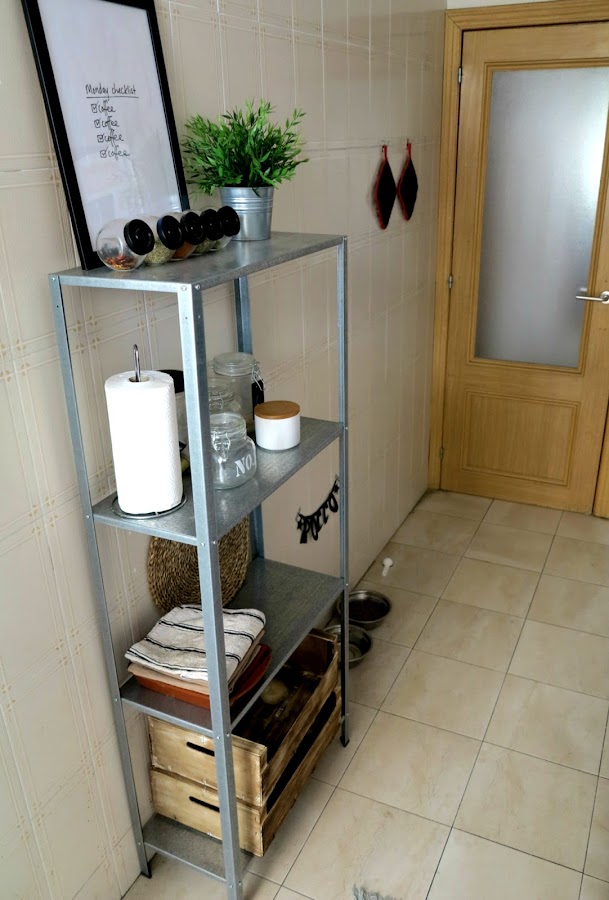 Ya os comente en un post que quería cambiar un poco el aspecto de la cocina, así que en la visita que hicimos en Ikea también cogí la estantería HYLLIS (perdonar la fotografía, pero es un poco difícil por la forma de la cocina). Estuve dudando entre esta estantería y la ALBERT, pero finalmente cogí esta. Todavía no se si le hare algún tuneo o la dejare así.
