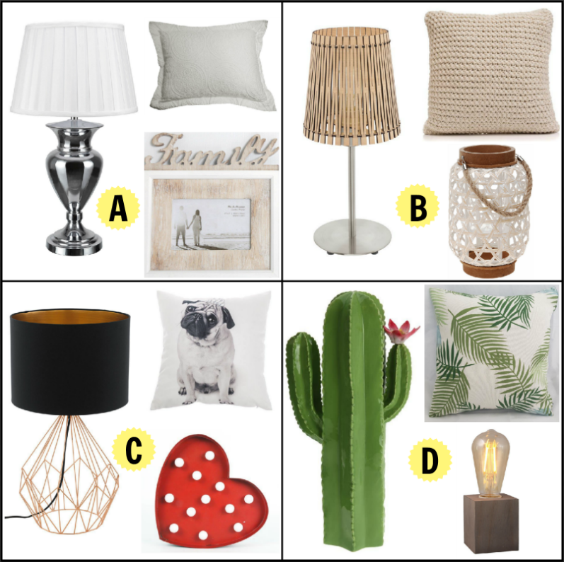 Imagina que tienes que decorar un rincón donde tienes un sillón y una mesita auxiliar, ¿cuál de estas combinaciones eliges?A. Lámpara clásica, cojín con tela brocada y un marco de fotos.