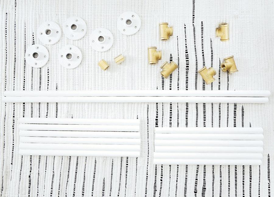 Para empezar necesitarás listones de madera de sección redonda pintados de blanco. Dos de 85 cm de longitud (o de la medida que prefieras en función de lo alta que quieras la estantería). También necesitarás 6 listones más de unos 25 cm, y otros 6 listones de 30 cm que serán los que determinen el fondo de la estantería. Busca también 6 baldas de madera blanca de 60 x 30 cm., 6 piezas de latón con forma de T de las que se usan para ensamblar tuberías, 4 remates dorados, 6 pletinas redondas pintadas de blanco para fijar los tubos a la pared, tacos y tornillos.
