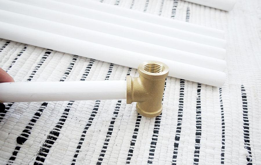La clave de este interesante y sencillo proyecto de bricolaje doméstico está en ir ensamblando los tubos con las piezas de latón con forma de T. Estas serán las que unan las diferentes partes de la estantería DIY.