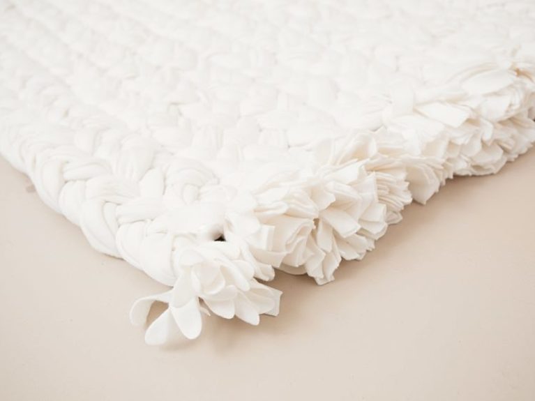 Esta almobra es perfecta para un dormitorio o baño, está hecha con la manta blanca de ikea, en un post antiguo ya os enseñamos el paso a paso para hacer esta alfombra.