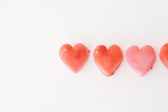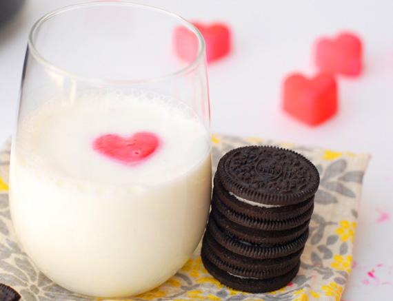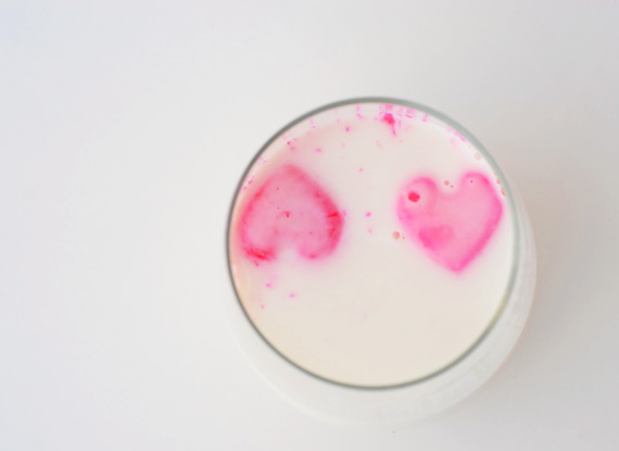 Todo lo que hay que hacer es poner leche (previamente teñida con colorante alimentario de color rojo) en moldes para hacer cubitos con forma de corazón y....volià...una manera preciosa de decirle te quiero!