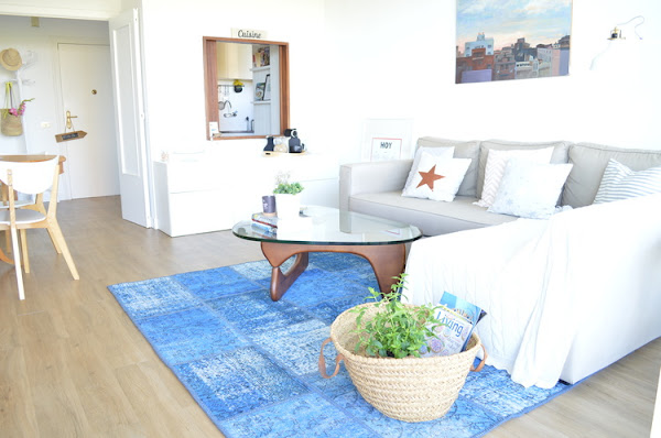 Bueno, esta opción la verdad es que pega muchísimo para estos meses de verano, y más donde yo vivo, que estamos a un paso del mar… Es una alfombra preciosa, la verdad, muy elegante y atemporal. Combinable con muchas gamas cromáticas y estilos decorativos, pero no me digáis que con el verde de las plantas no forma una combinación espectacular!!! No sé, a mi desde luego la combinación azul y verde cada vez me gusta más y me resulta más relajante… ¡Ya haremos un post algún día sobre esto! ;)