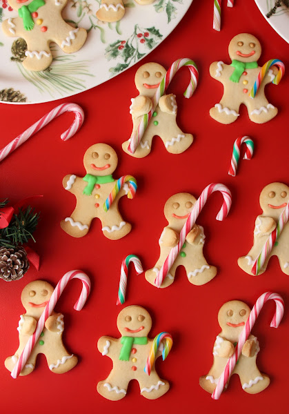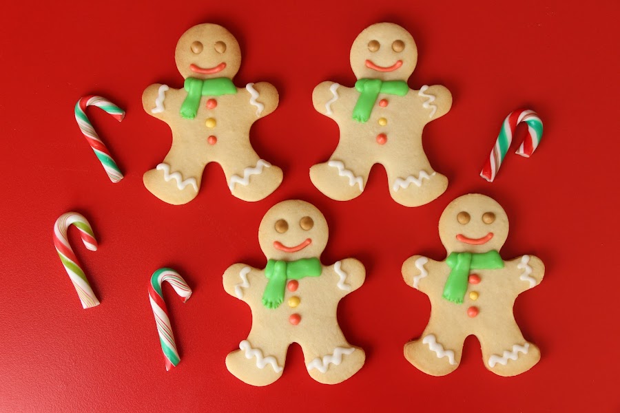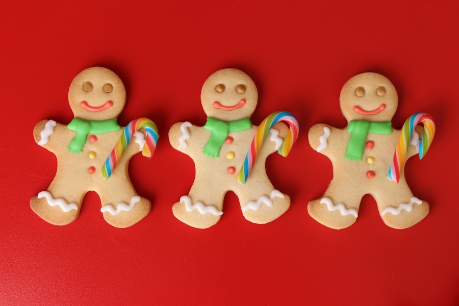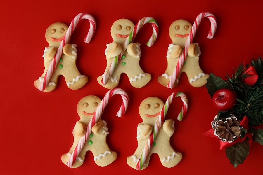 Por internet había visto unos hombres de jengibre agarrando un bastón de caramelo y nos pareció que eran diferentes, por lo que hicimos unos agarrando un bastón grande y otros con uno pequeño en la mano.