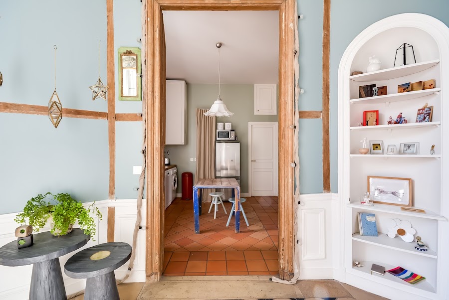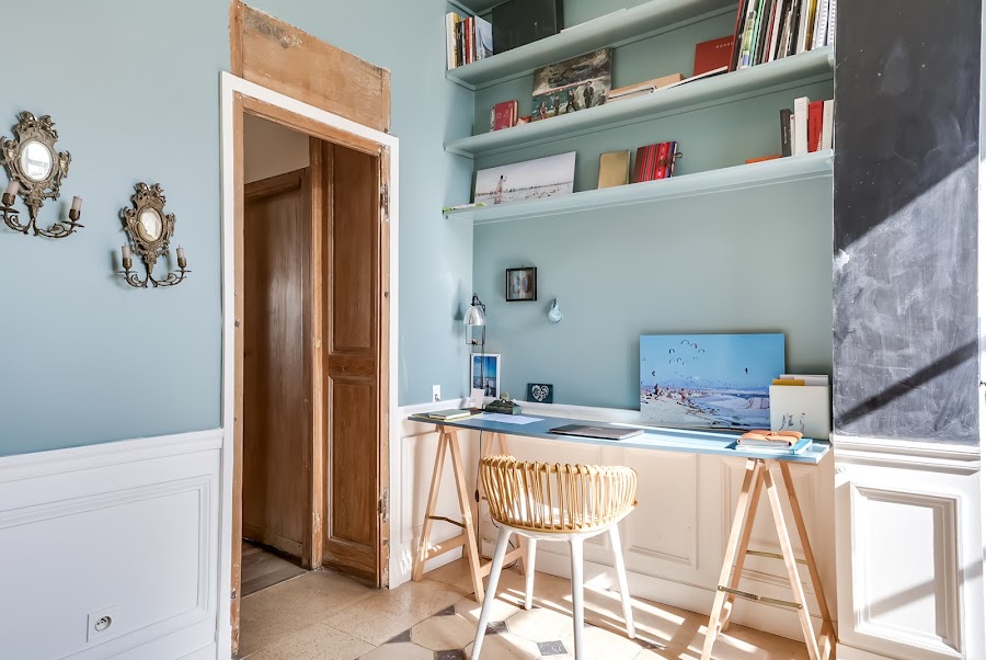 En la cocina domina el estilo provenzal con un precioso solado de barro cocido, aires rústicos, colores naturales como el verde, el lavanda o el azul, creando un cierto aire vintage de campo. La cocina se puede ver desde la entrada del piso. La entrada se pintó en azul claro y se restauró la carpintería original de la casa. En la entrada, se aprovechó un espacio para instalar un pequeño despacho.