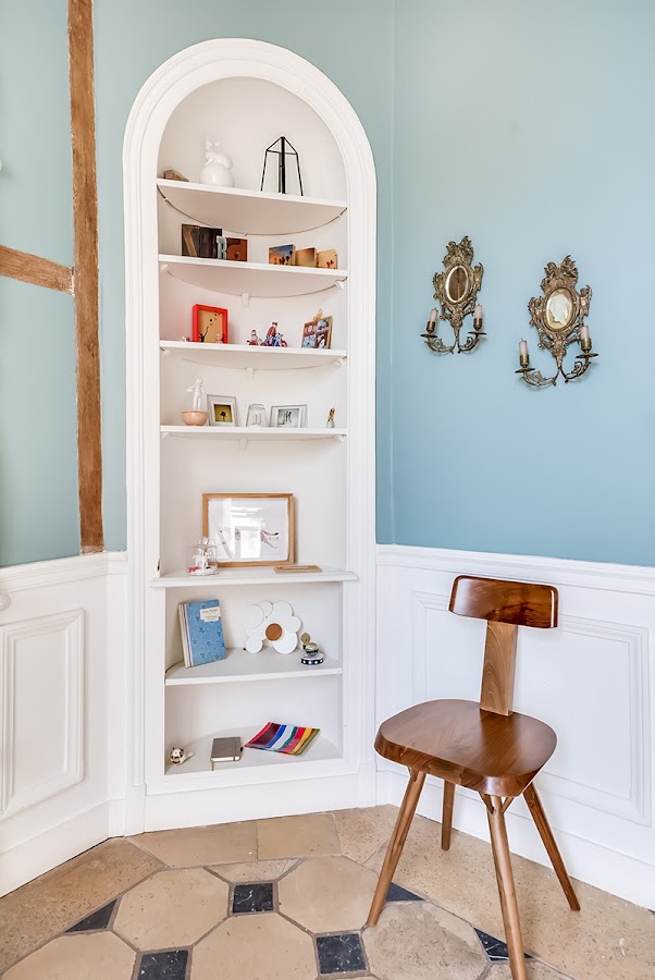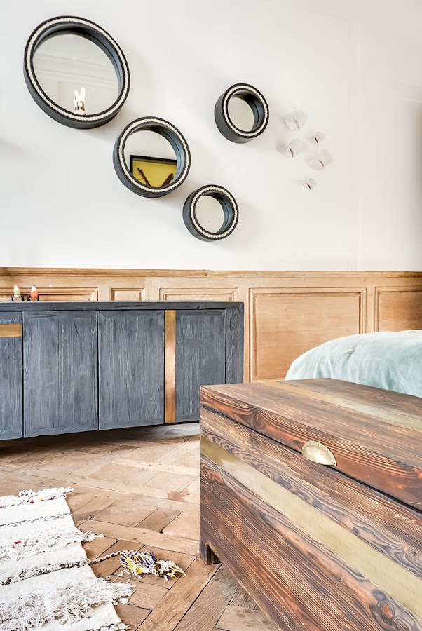 El dormitorio esencia parisina. Al fondo, frente a la ventana, un escritorio vintage adquirido en Bélgica aprovecha la entrada natural de la luz. Toda la estancia cuenta con un zócalo de madera que le aporta un toque nórdico y de naturalidad. Muchas de las piezas de mobiliario son creaciones de la diseñadora, como las mesas de la entrada, la coffee-table, la consola y las lámparas de pie en el salón, las sillas y el banco en el comedor, así como las mesillas de noche y el cofre en la habitación, entre otros.