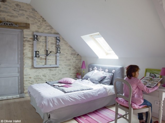 Una pequeña puerta de granja antigua reciclada y pintada, se ha decorado con nuevos accesorios para el acceso al cuarto de baño. Las habitaciones son claras y tranquilas, bajo los aleros del tejado a dos aguas, bañadas en una luz suave, muy hermosa y típica de Gran Bretaña. En las habitaciones de los niños, donde quería una decoración fresca y chispeante, se ilumina el blanco con rosas y fucsias. Habitaciones sencillas cuya decoración puede cambiar, dependiendo de la edad y sus deseos.