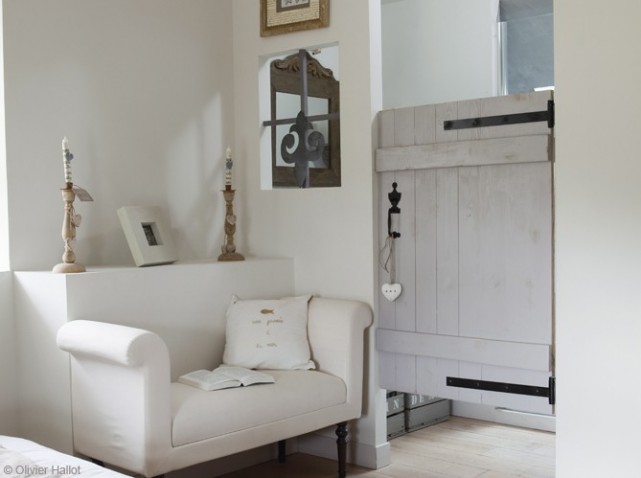 Desde el principio el interior se ilumina suavemente. Se decidió dejar intactos los adorables nichos murales, tallados en la piedra, para que sirvan de vitrinas para hermosas composiciones que Sandra realiza, o para sus hallazgos en los mercados de pulgas. Garantía de sencillez y serenidad, el blanco es muy agradable y se consigue, en este hogar, el deseado efecto decorativo.