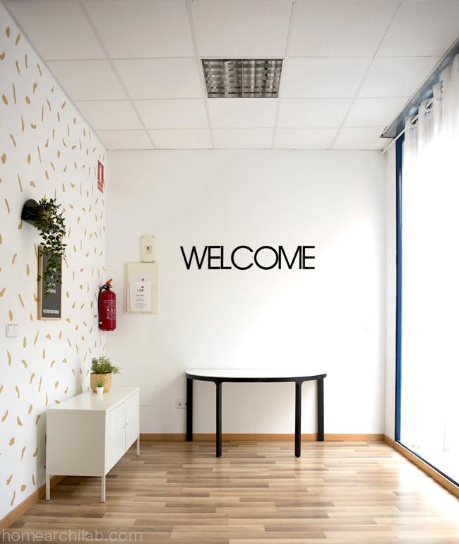 Sobre ella, unas letras de metacrilato negro con la palabra welcome (bienvenidos).