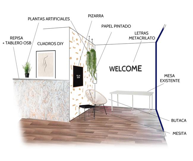 En cuanto a la zona de recepción, se pretende causar un impacto visual positivo que atraiga y de una imagen más moderna del local.