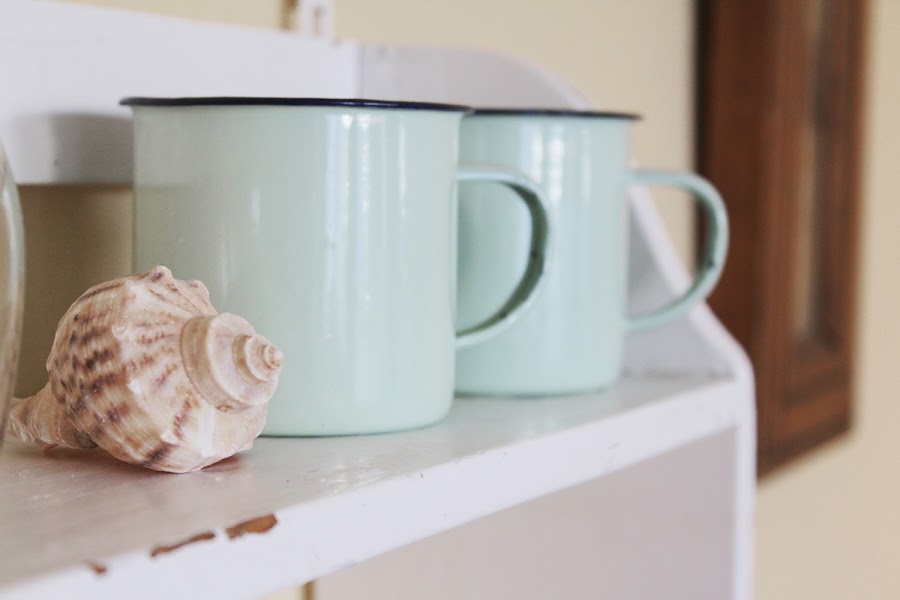These cups I bought at a bazaar, I love the tin things and it color give it a look retro what I find charming. The shells and other pieces from the sea I love to incorporate them in every corner to remind the sea that is away from me.