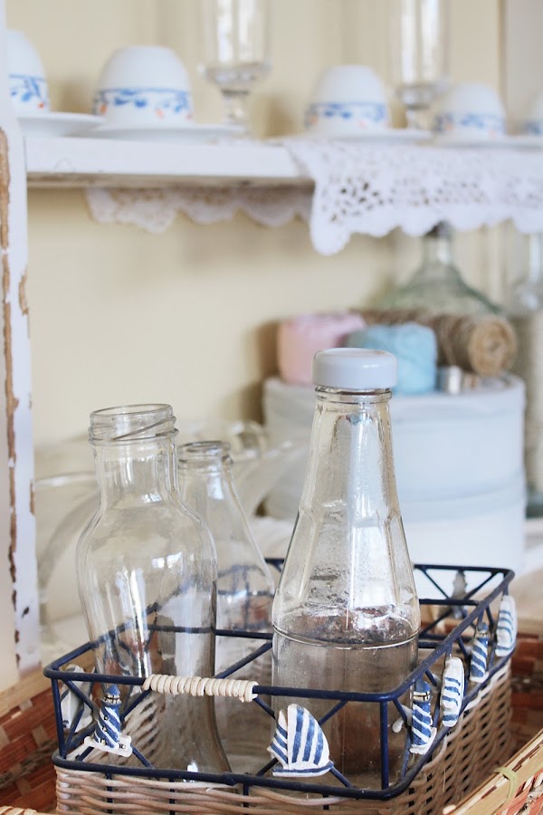 You know that decorating with glass bottles, is economic, is in fashion and is a great way to recycle. I"ve done this many times you can see it here, but this time, in the first bottle, I combined, some arina to simulate white sand in beaches and some shells from the beach, in the second I picked up my dry roses to the garden and the third a little dried lavender.