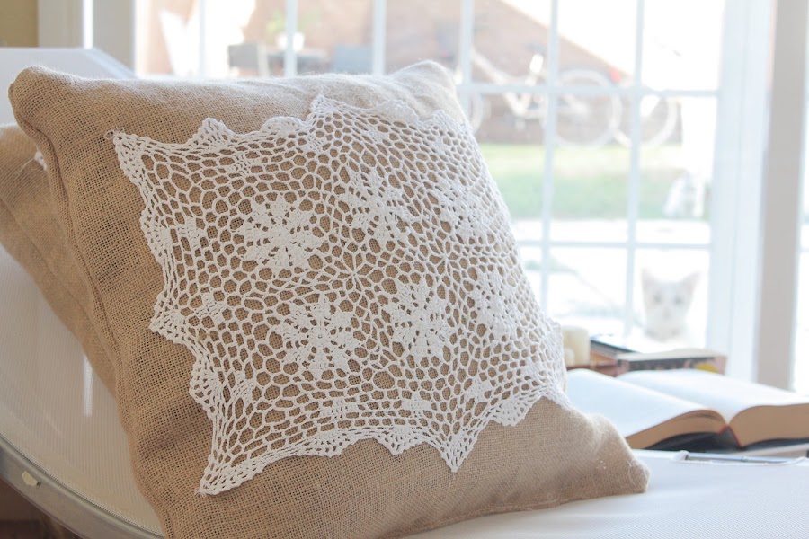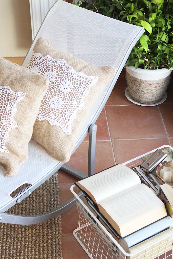 Another things I wanted to do, was to give a new look to these pads. The idea of ??burlap or fabric bags with crochet is not mine. The other day in my visit at the mall I saw for sale combined cushions with this textures so I thought it was very simple to make and also I had this fabric in home. About the crochet piece I bought made??, but obviously if you"re good making crochet you can always do it yourself, this is not my case.
