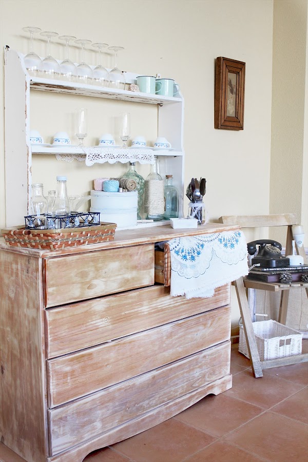 En cuanto al acabado del mueble os diré que la cajonera era de estas típicas con este barniz amarillento así que pensé en lijarlo mucho hasta quitarle el brillo del barniz y darle ese aspecto desgastado. Después hay que pasarle cera incolora para proteger el mueble.