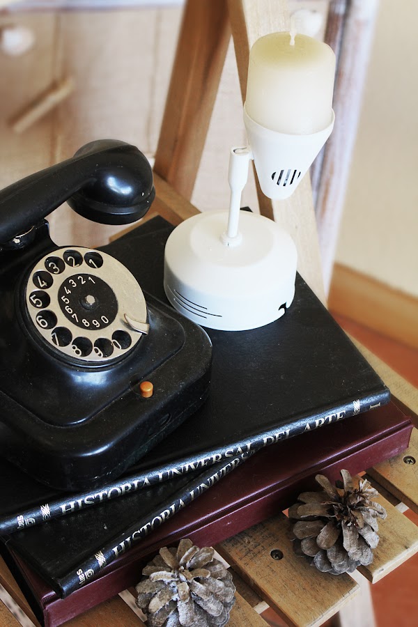 Here"s this old phone that I bought from a flea market in Benahavis (Malaga) a perfect place to get cheap and specials things. I promise to bring you a new post of this market in the future. As the candelabra is another recycling, I had a small lamp broken saved in the storage room, so I painted in white, I put a candle in it and little else.