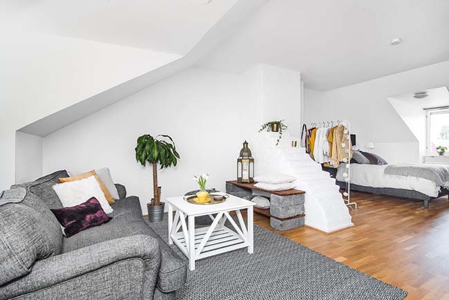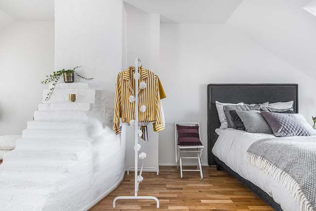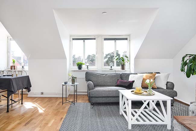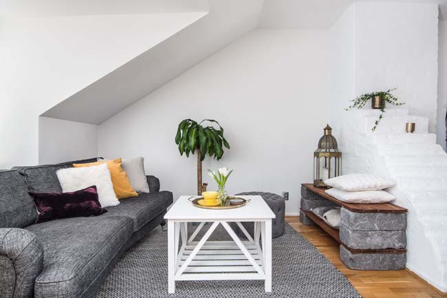 La mejor manera de contrarrestar el gris, que es elegante pero puede ser un poco triste, es darle luz con el blanco y pequeños toques de mostaza. En este caso este tono es un acierto para dar vida a este apartamento nórdico, al igual que las plantas.