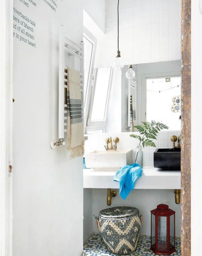 Para potenciar la luminosidad la elección de revestimientos fue muy importante. Un laminado de madera en acabado claro en el suelo y paredes pintadas o revestidas con azulejos blancos actúan como superficies reflectantes que multiplican la luz natural. Incluso las losetas hidráulicas que pavimentan las zonas de agua, como el cuarto de baño o una pequeña franja en la cocina, incluyen un fondo blanco. Con la distribución óptima y la luminosidad interior garantizadas, solo quedaba centrarse en la decoración.