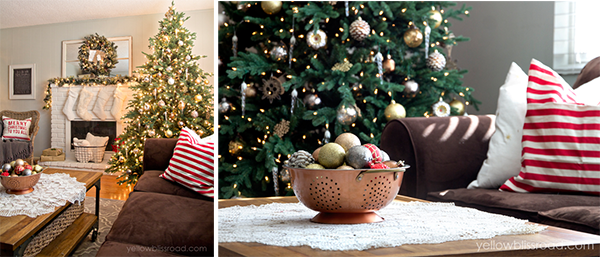 Fijaros especialmente en las flores de pascua que han colado encima de la alacena en la parte del comedor - me encanta la idea de decorar también esta parte del mueble - y la idea de utilizar un colador (antiguo) como centro de mesa en la parte del sofá - como siempre digo: demos otro uso a los objetos cotidianos.