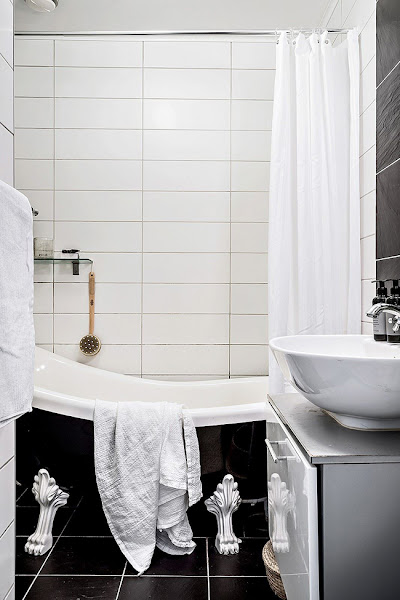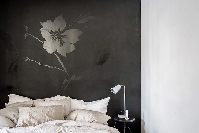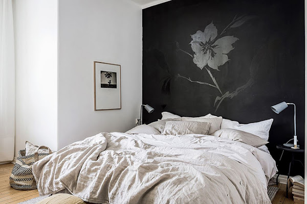 Incluso la composición de flores y plantas que hay sobre la mesa de centro del salón me parece de sobresaliente y una buena idea si ves tu salón un poco soso o sin vida. El resto de la casa es igual de bonito, y la pared del dormitorio sigue la atrevida tendencia de pintar todo de negro.