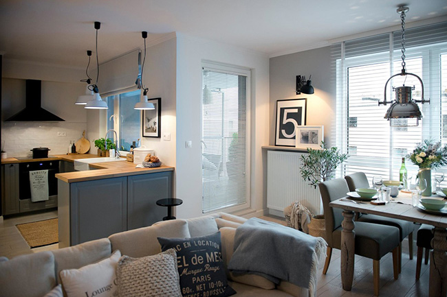 Salón, comedor, cocina abierta tipo office y dos habitaciones, la decoración es muy neutra, grises, negros, tonos arenas y fibras naturales, una composición llena de calidez y muy dinámica que permite que varios estilos convivan juntos.