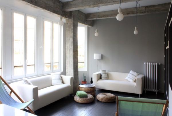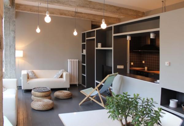Al derribar los tabiques y convertir las tres estancias en una sala de estar/comedor, se recupera la visión global del mirador, y de paso se maximiza el espacio de este piso de 95 m². La transición en los colores neutros de la decoración contribuye a la separación de los espacios. El color blanco de las ventanas y el mobiliario se va oscureciendo en tonos grises claros en las paredes y pilares de hormigón hasta llegar a los grises más intensos. Las hamacas azuladas, los pufs de mimbre y las bombillas colgando contrarrestan con el señorío de los ventanales y del edificio, logrando a su vez un ambiente cálidoy de relax.