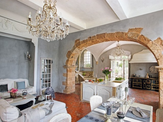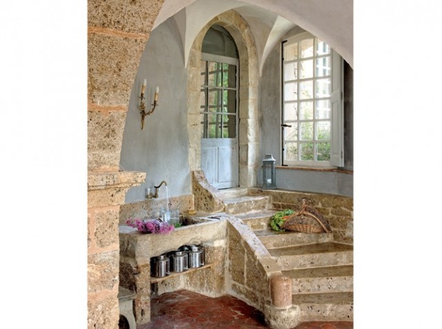 En la rehabiliación se mantiene el alma de la construcción y sus materiales originales, como se muestran en el viejo banco chimenea esculpida en mármol y que muestra sus curvas suaves. El color de las paredes se crea mediante la mezcla de pigmentos naturales de vid negra y tierra con una lechada de cal. En la planta baja, tres de las piezas se combinan en una gran cocina, comedor y sala de estar y dos habitaciones se han unido ahora en una sola grande para la música. Una vez unidas las pequeñas habitaciones contiguas, la planta baja ha visto cómo sus volúmenes se han redistribuido en grandes espacios de vida. Así, en lugar de un antiguo muro de carga se ubica actualmente una magnífica bóveda de piedra toba de una cantera cercana. La isla en la cocina, diseñada por María, se cubre con una encimera de mármol.