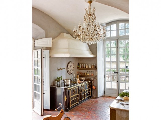 La cocina cuenta con esta "estufa" de hierro fundido preciosa que calienta la sala de estar todo el invierno. La campana ha sido realizada con yeso. Un gran ventanal creado en el hall sirve para iluminar una entrada y una escalera demasiado oscura. Las baldosas antiguas, la piedra, los marcos son todas del siglo XVIII, como la escalera de piedra tallada en bloques. Se pretende dar a conocer la cuidadosa rehabilitación a través del refinamiento de los materiales, los colores sobrios y los muebles. Arriba se ubican las habitaciones, donde el ambiente es casi monástico: yeso encalado blanco y muebles mínimos que se reducen al máximo.