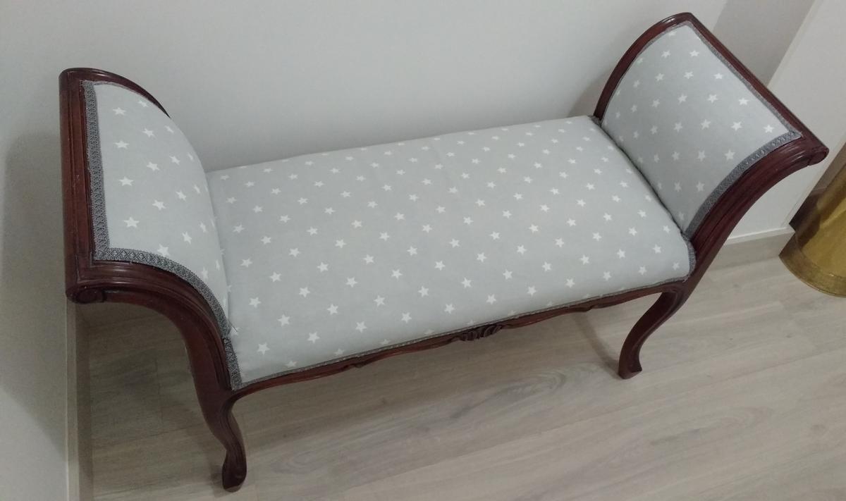 Así que decidí encontrar una tela en tono gris que combinara con el suelo (aunque por la luz de las fotos no se aprecie mucho) y me lancé a la aventura de la tapicería.