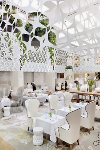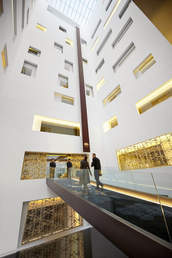 Atrio de dos alturas con una decoración en tonalidades blancas acentuadas por la cálida luz que entra a través del techo de cristal.