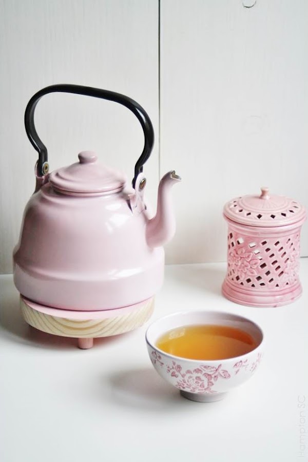 Un té de aires romáticos con mi tetera de peltre rosa,