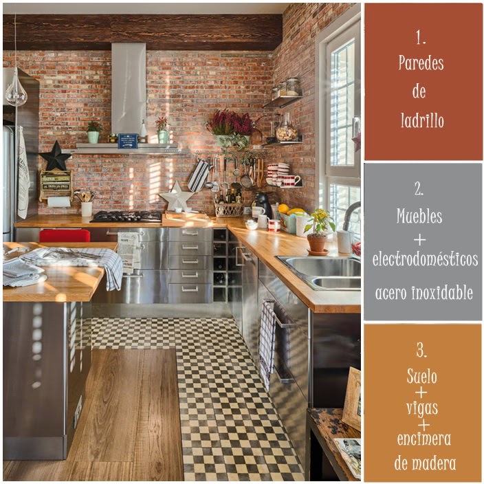 ¿Quién no sueña con tener una cocina así? Por favor que levante la mano.....Porque vamos, a lo mejor no es de tu estilo pero yo he de reconocer que a mi me vuelve loca. Me imagino ahí mientras disfruto preparando comidas deliciosas.....Me encanta su estilo, su personalidad, sus detalles, la combinación de colores, la mezcla de materiales y ese suelo......wow. Las paredes de ladrillo recuerdan a los lofts de Nueva York y los toques de estilo industrial junto con los detalles más rústicos convierten esta cocina en una estancia cálida y acogedora.